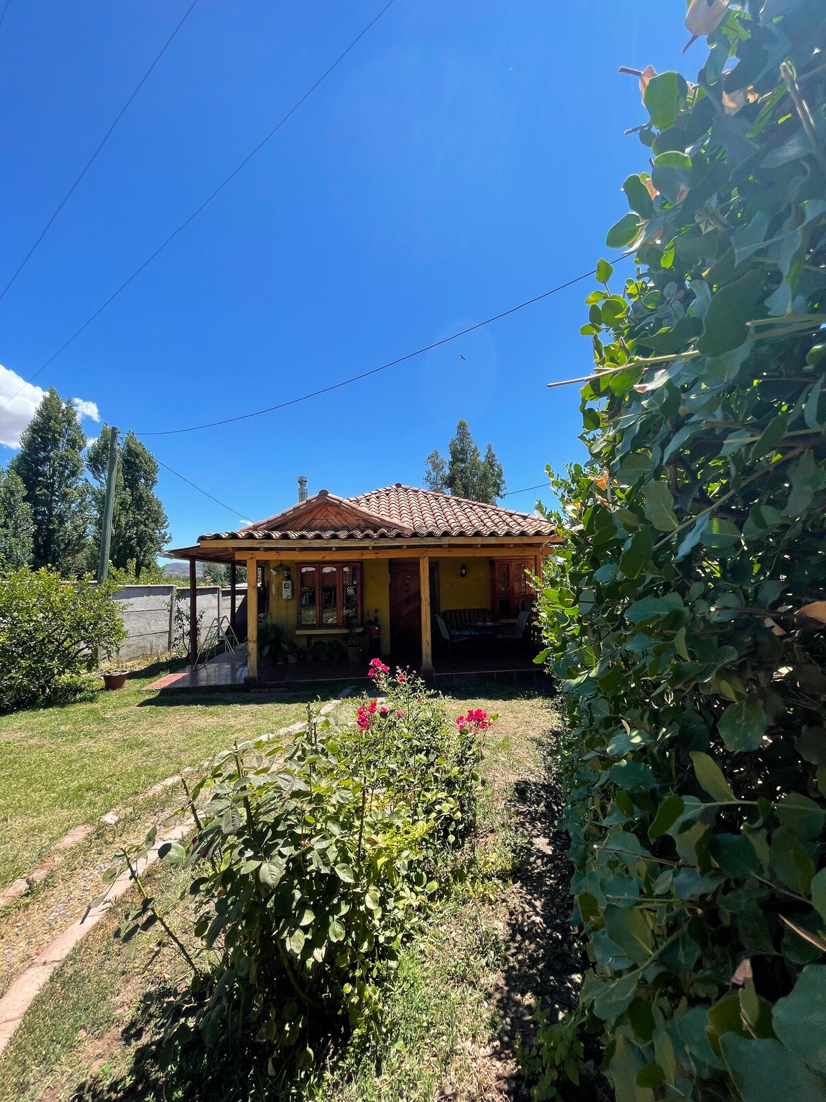Casa de campo, con 2000 mts de jardin. La casa es de madera y adobe, con grandes ventanas que permiten la entrada de mucha luz. El jardin es frondoso y natural; cada una de las plantas y árboles fueron plantados por nosotros cuando construimos la casa. Si estas buscando tranquilidad, naturaleza y. un buen descanso, este es el lugar.