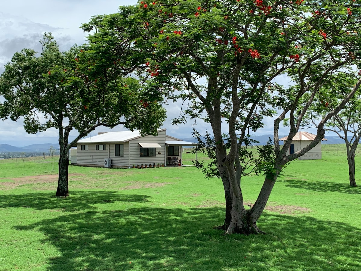 Մեր 2 ննջարանով քոթեջը տեղադրված է մեր 200 հեկտար գամասային անասնապահական սեփականությունում: Մեր տունը 50մ հեռավորության վրա է: Քոթեջը ցածր է և ունի հանգստացնող լեռնային տեսարան դեպի Բրիսբենի հովիտ: Գտնվում է 3 կմ հեռավորության վրա Toogoolawah եւ Brisbane Valley Rail Trail. Խաղաղ միջավայր ՝ երկրի հանգիստը վայելելու համար ։ Վայելեք ցնցող մայրամուտներ և արևայրուքներ մեր դիտման տարածքից ։ Խոշոր եղջերավոր և ձիեր, որոնք խաղաղորեն արածում են մոտակայքում ։ Մենք մոտ ենք Ramblers Skydiving կենտրոնին, Watts Bridge Airfield - ին և կարճ ճանապարհ դեպի Սոմերսեթ ամբարտակ: