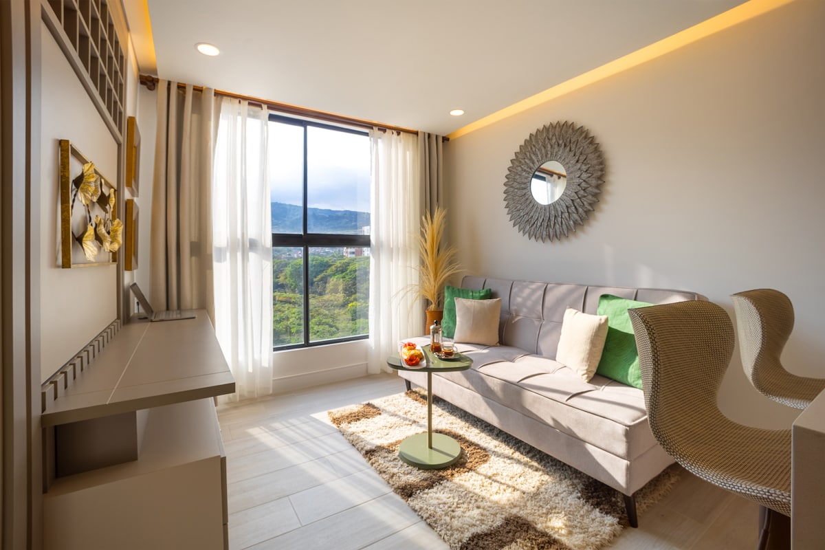 Այս բնակարանի ստեղծման ոգեշնչումը Ֆրանսիայում ապրող ֆրանս-կոլումբիական զույգն է և նրանց ճանապարհորդությունները Եվրոպայում։ Ժամանակակից, մինիմալիստական և ջերմ տարածք, որը ձեզ կօգնի զգալ ինչպես տանը։ Վայելեք Ֆարալյոնես դե Կալիի համայնապատկերային տեսարանը, անվճար կայանատեղին, օդորակիչը և Wi-Fi-ը (900 Մբիթ/վ)։ Այն ունի Prime Video-ով հեռուստացույց, լիովին կահավորված խոհանոց, հարմարավետ երկտեղանի մահճակալ և բազմոց-մահճակալ, որոնք իդեալական են 4 հյուրի համար։ Նշում. շենքի ընդհանուր տարածքները դեռ միացված չեն։