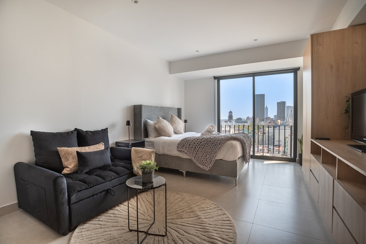 Վայելեք նորաոճ հանգիստ այս գեղեցիկ բնակարանում ։ Շենքը նոր է, ունի վերելակ, 24 ժամյա անվտանգություն և գտնվում է Հեղափոխության հուշարձանից 1 փողոց, որը շատ մոտ է քաղաքի կենտրոնին և Ռեֆորմային: Մի քանի քայլ հեռավորության վրա կգտնեք ռեստորաններ, սրճարաններ, տեղական հացաբուլկեղենի խանութներ և խանութներ: Բնակարանը նախագծված է մեր հյուրերի համար, ունի երկտեղանի մահճակալ, հյուրասենյակ, լոգասենյակ, լվացքի մեքենա, չորանոց և ամբողջական խոհանոց ։