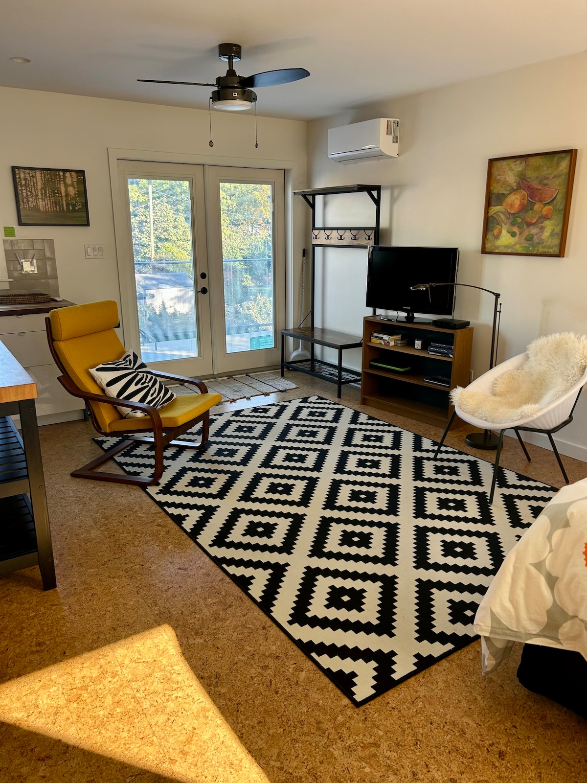 Նոր ավելացված Level 2 EV լիցքավորիչ: Լոֆթհաուսը հիմնական մակարդակում ունի 4 հոգու համար նախատեսված քնելու կամ բնակելի տարածք ։ Ջեռուցվող բետոնե հատակներ ։ Լիովին համալրված է հարմարավետ այցի համար ։ Անտառային արահետների և գյուղի հարմարությունների մոտ ։ (ըստ ցանկության) լոֆթի եզակի ծալովի սանդուղքը կտրուկ է, ուստի մինչև 6 տարեկան երեխաները հսկողության կարիք կունենան ։ Սանդուղքը կարելի է ապահով պահել պատին ։ Ապահով պահեք 3 հեծանիվ ներսում, իսկ դրսում կարող եք գտնել հեծանվի տակդիր կամ լվացքի կայան ։
