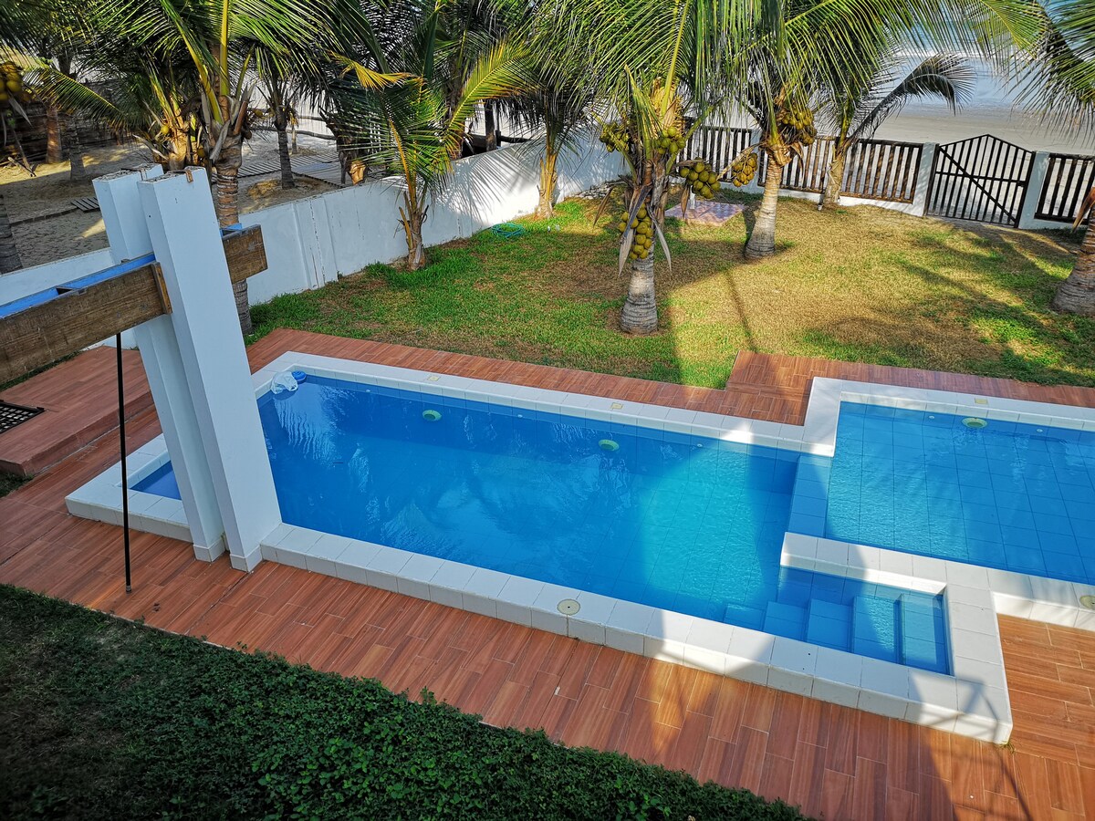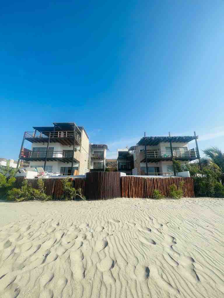 No querrás irte de este lugar tan único y encantador. El mar calmo y una playa increiblemente larga y pacifica sera digna de una paz increible. Contamos con Zona de hamacas, una piscina pequeña, comedor acogedor, uso de cocina con Microondas y refrigeradores. Contamos con wifi en el local. El hotel esta en la primera linea de playa. Seguridad. Nuestro anfitrion/administrador es doctor calificado en Acunpuntura y Digitopuntura, hara que la experiencia sea relajanta y liberaras tus chakras.