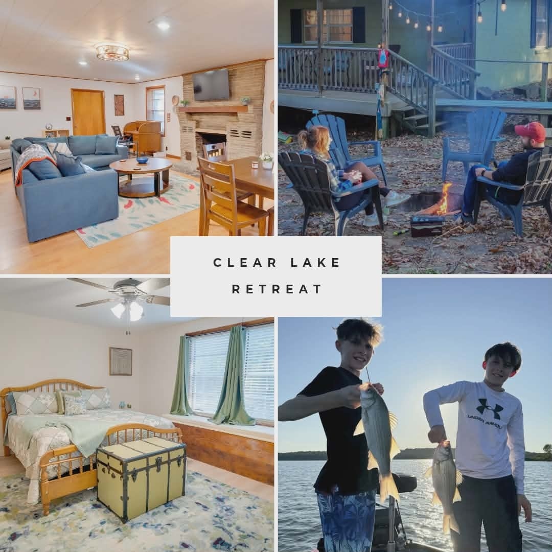 Welcome to your inviting home away at Tenkiller Lake. Tucked away in the trees with few neighbors across the road. Inside has all the thoughtful touches to help you unwind: Cook a fish fry, stories around the firepit, board games while the rain taps on the tin roof, dine and relax on the covered deck, or just kick back with the big screen TVs. Ask about our free early check-in / late check-out times. Loved by families, friend groups, those here to fish, hunt or work on expansions in Cookson.