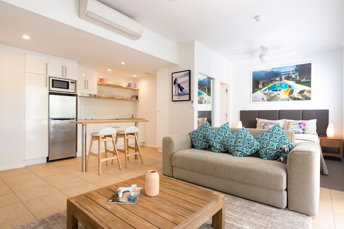 One bedroom luxury apartment on Port’s Main Street, steps away from all the best restaurants and takeaways, retail stores, supermarket, bottle shop, bakeries, the Port Douglas markets or the beach! Enjoy the convenience of not only the most central location but the resort’s heated pools, a lift to your room and the outstanding amenities of this apartment - high speed wifi, dishwasher, Italian appliances, coffee machine, frame TV, Bose speaker and a queen size daybed with views over the Daintree