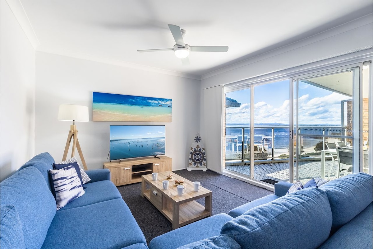 This apartment is only 600m to Nelson Bay marina, shops, bars, cafes & restaurants. It has magnificent beach views and only a 2 min walk to Fly Point Beach. Living area flows to an undercover tiled terrace, then onto a grassed area. This is a perfect getaway, well equipped and beautifully presented. Linen, bath and beach towels provided and bed made. There is a construction site next door though the noise is minimal or if any. Portable cot available. Pet friendly. Weber Q bbq available.