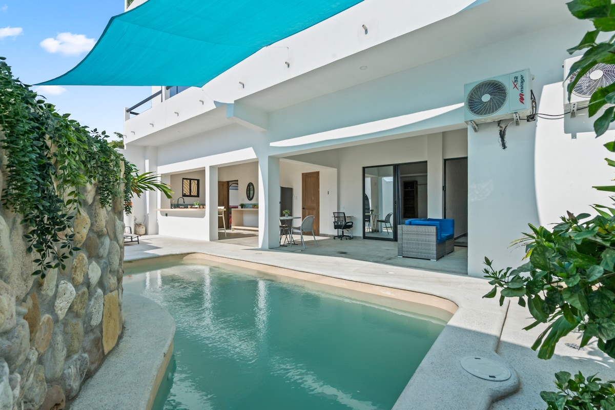 You'll enjoy this private retreat just 3 min walk to Paradise Beach. Your own Private Pool with natural outdoor shower, open concept full kitchen with filtered drinking water! Living room with smart TV. Newly built 2025! A/C in each bedroom. All the comforts you’ll need for a restful vacation. Tommy Bahama Beach chairs & Umbrella available. Taco stands on nearly every corner. Delicious Crepe restaurant kitty corner! * Sorry no pets. Inquire re: Golf cart on site for rent.