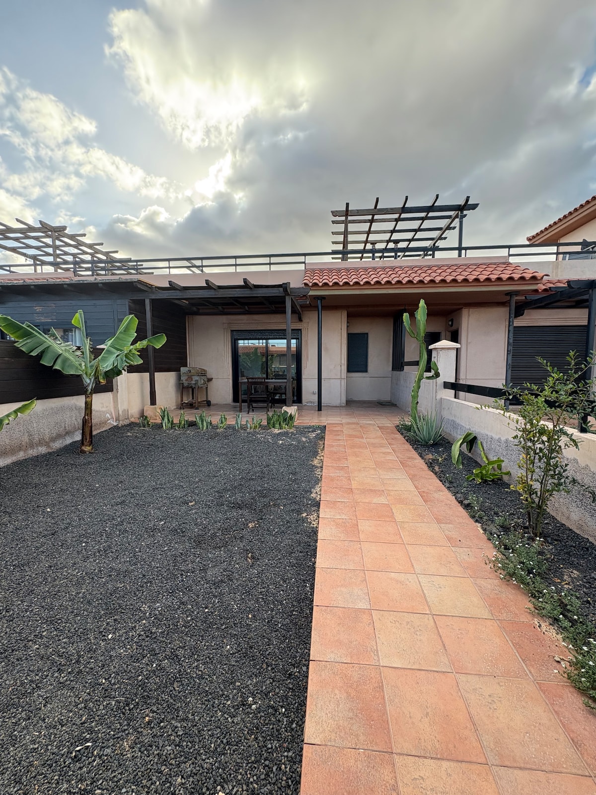 Impresionante y exclusiva villa independiente, situada en primera linea del mar, con vistas a la bahía de Corralejo, isla de Lobos y Lanzarote. Consta: en planta baja de un amplio salon y cocina, dos dormitorios, dos baños, jardín con terraza y barbacoa, y patio con porche y en planta alta de una suit con dormitorio, salón, baño, vestidor y zona chillout con solarium. Mi alojamiento esta ideal para parejas, aventureros, familias (con hijos), y grupos grandes.