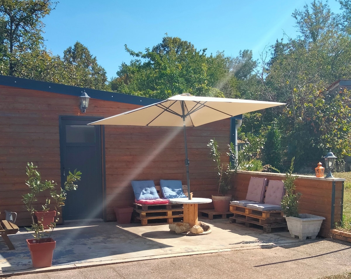 Maisonnette indépendante avec salle de sport (muscul, tapis avec TV, clim), ping-pong et jacuzzi (en été), vélos. Parking privé. Climatisée, ossature bois, proximité centre, au calme, 2 terrasses, jardin fleuri. Salle de bain indépendante avec WC. Cuisine équipée. Possibilité couchage en mezzanine avec matelas 2p ou salon avec canapé convertible confortable. Draps, serviettes, lave-linge... tout est fourni. 2p maxi ss enfant (sauf bb, raison de sécurité), 2 nuits mini. Caution RBNB 500 €.