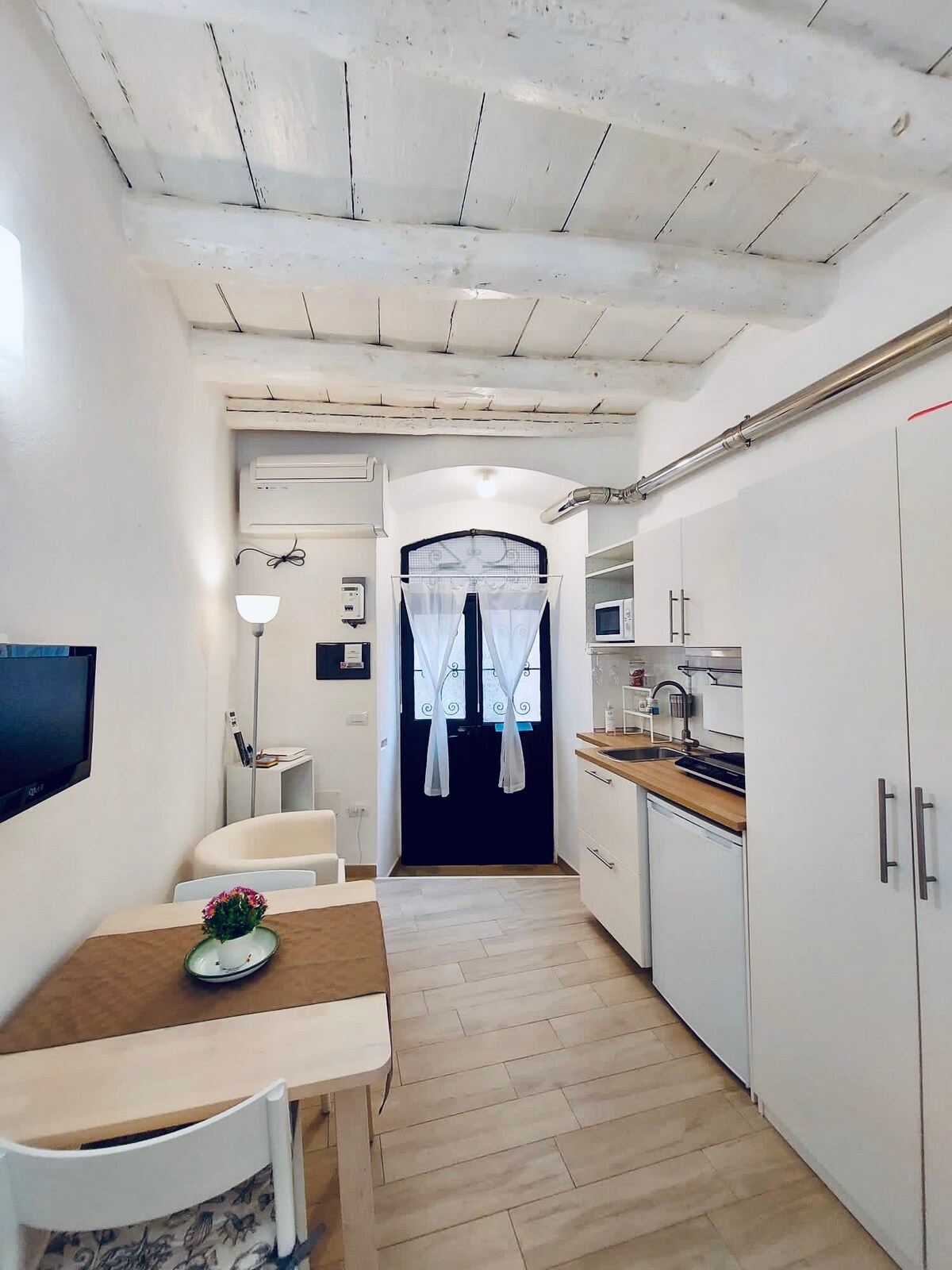 Romantico monolocale climatizzato in centro, con parcheggio riservato. E' composto da open-space con divano letto matrimoniale e angolo colazioni ( frigobar , lavabo, microonde, macchinetta per il caffe' , bollitore, senza piano cottura), bagno con doccia, phon,TV, biancheria letto, asciugamani e servizio cortesia inclusi.Tutti gli infissi sono dotati di zanzariere.