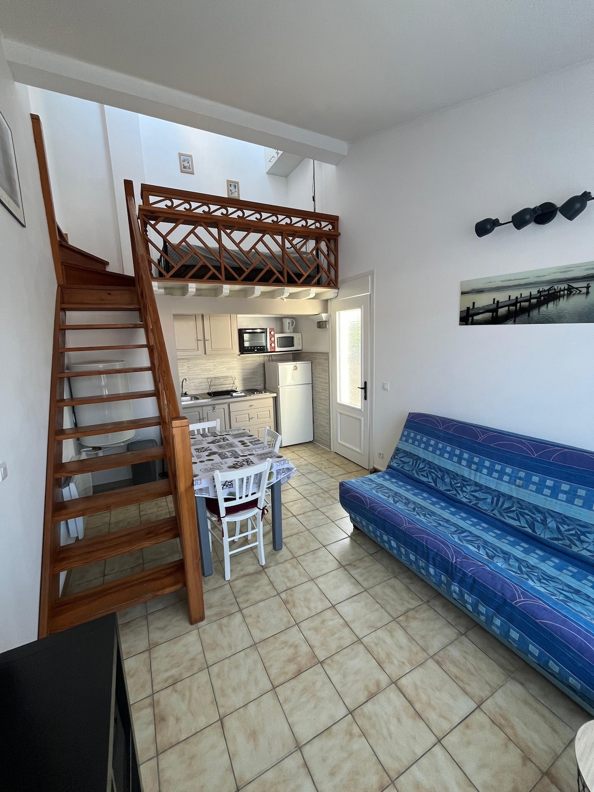 Deux pièces avec terrasse exterieure. Situé à 500m de la plage et 700m du centre plage ( commerces , marchés...) et le golf tout proche. Vous profiterez d'un appartement dans une villa de trois appartements avec terrasse individuelle, d'un salon ouvert sur la cuisine avec canapé (1m40X1m90) , télé, tout le necessaire de cuisine, à l'étage une mezzanine avec un lit simple (80cmX190cm), salle de douche avec machine a laver et une chambre avec un lit 2 personnes (1m40X1m90) et télévision.
