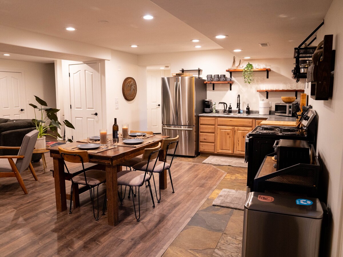 Համեցեք վայելելու այս վերափոխված, մաքուր հարկաբաժինը մասնավոր թաղամասում ։ Գտնվելու վայրը մոտ է մոտակա կիրճերին, գնումներին, ռեստորաններին և ավտոմայրուղուց օգտվելու հնարավորությանը ։ Սա մասնավոր նկուղ է 2 BR, 1 BA, ընտանեկան սենյակով և լիովին կահավորված խոհանոցով, որտեղ հարմարավետորեն կարող են քնել 4-6 անձ (QN մահճակալ, 2 Dbl մահճակալներ)։ 70դյույմանոց 4K սմարթ հեռուստացույցներ ՝ հոսքային հեռարձակմամբ ։ Երկարաժամկետ այցերի համար հասանելի է հատուկ լրիվ չափի լվացքի մեքենա կամ չորանոց ։ Հասանելի է Pac - N - Play և մանկական աթոռակ ։