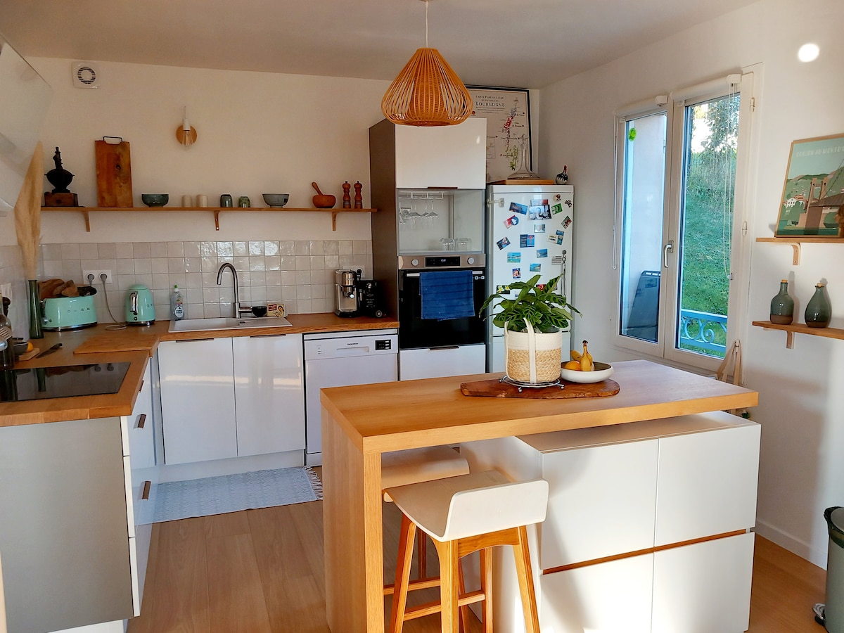 Monts d'Or - ում, Լիոնից 15 րոպե հեռավորության վրա գտնվող բնական տարածք, անկախ տեղավորում վիլլայում, որտեղ մենք ապրում ենք: Առանձին տեռաս և մուտք մարզասրահ և շոգեբաղնիք ՝ ըստ ամրագրման: Ամառ ՝ լողավազան առավոտյան 8 - ից մինչև 10 - ը, իսկ երեկոյան 2 - ից մինչև 17:30 - ը: Տեսարան դեպի Սաոն ։ Արշավային արահետներ, լեռնային հեծանվային զբոսանքներ: Ռեստորաններ, Demeure du Chaos թանգարան, Guinguettes է Saône. Lyon Perrache երկաթուղային 12min գնացքով (երկաթուղային կայարան 15 րոպե քայլել), Part - Dieu 35 րոպե ավտոբուսով:
