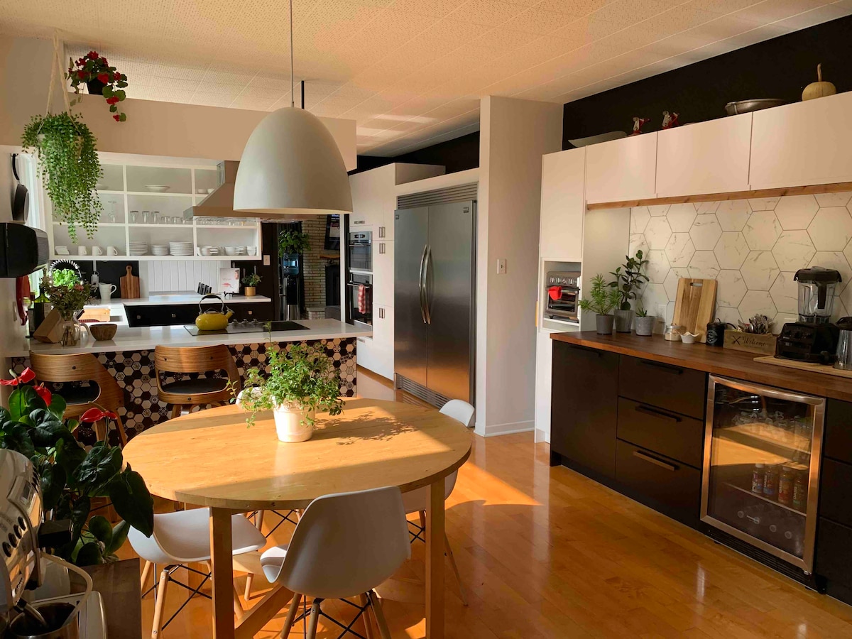 #CITQ 304712 exp. 30/04/2026 Պայծառ կացարան իմ տան կիսանկուղում ՝ ամբողջական խոհանոցով, որը շատ լավ կահավորված է ։ Առանձին և ինքնամփոփ մուտք ՝ ձեր առանձնության համար ։ Կենտրոնական կղզի ։ Հյուրասենյակ ՝ աշխատանքային տարածքով, 4K հեռուստացույց, Netflix, անսահմանափակ Wi - Fi ։ Ընդարձակ գլխավոր ննջասենյակ ՝ հեռուստացույցով, երկտեղանի մահճակալով և մեկտեղանի մահճակալով ։ Երկրորդ միացված ննջասենյակ ՝ Սմարթ հեռուստացույցով, երկտեղանի մահճակալով և մեկտեղանի մահճակալով ։ Տան ձախ կողմում կա ձեր առանձին բացօթյա տարածքը ՝ խորովածով, պիկնիկի սեղանով