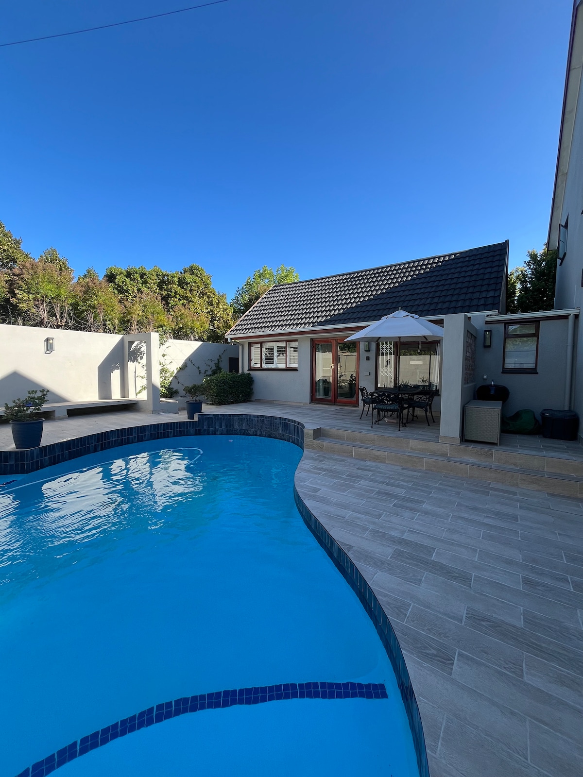Գումարի հիանալի արժեք ։ Բացօթյա բնակելի տարածք ՝ ագարակային խոհանոցով ։ Հարմարավետ հիմնական ննջասենյակ, որտեղից բացվում են Սեղան լեռան տեսարանները ։ Մեծ լողավազան և առանձին մանղալ ։ Խոտաբույսերի և բանջարեղենի այգի ։ Գերազանց ռեստորաններ, այդ թվում ՝ երեխաների համար հարմար սննդի կետեր և զբոսայգի ՝ երկու րոպե հեռավորության վրա ։ - Անվճար WiFi - Լեռնային զբոսանքներ + դաշտ - Կատարյալ գտնվելու վայր - Անվտանգ և խաղաղ - Թվային անվտանգություն