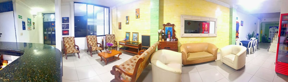 Nuestras Instalaciones se encuentran en la mejor ubicación, en pleno centro de la ciudad. Cuenta con Parqueadero cortesía para Huéspedes, habitaciones con aire acondicionado, televisor, internet wifi, No incluye desayuno. Contamos con una recepción (Lobby) amplio donde puedes recibir visitas, al igual que también disponemos de una espectacular terraza abierta al cielo.