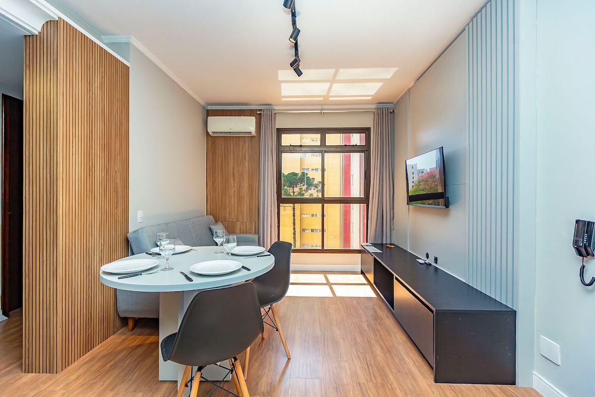 Ժամանակակից ստուդիա Կուրիտիբայի կենտրոնում։ Հարմար է մինչև 4 հյուրի համար, կա 1 երկտեղանի մահճակալ և 1 բազմոց-մահճակալ։ Մոտ է ռեստորաններին, խանութներին և տեսարժան վայրերին, ունի ջեռուցվող և բացօթյա լողավազաններ, խաղասենյակ, համատեղ աշխատանքային տարածք և շուրջօրյա դռնապան։ Բնակարանում կա՝ տաք/սառը օդ, Wi-Fi, 42 դյույմ Smart TV, կահավորված խոհանոց և անկողնային պարագաներ։ **ԿԱՅԱՆՔԸ ՉԻ ՆԵՐԳՐԱՎՈՒՄ ՕՐԱԿԱՆ ՎՃԱՐՈՒՄ**