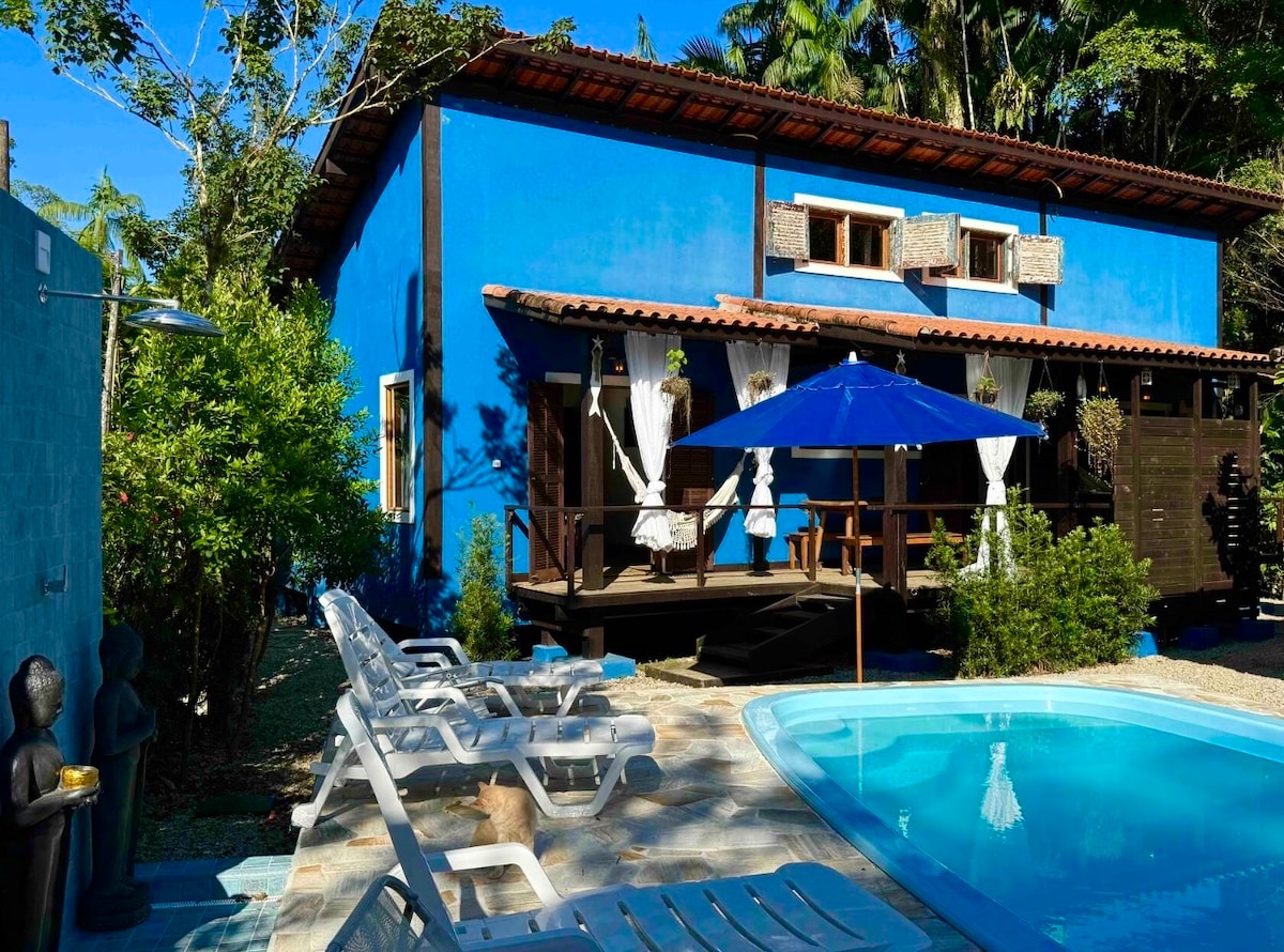 Bangalô piscina e rio Cambury em meio à natureza.