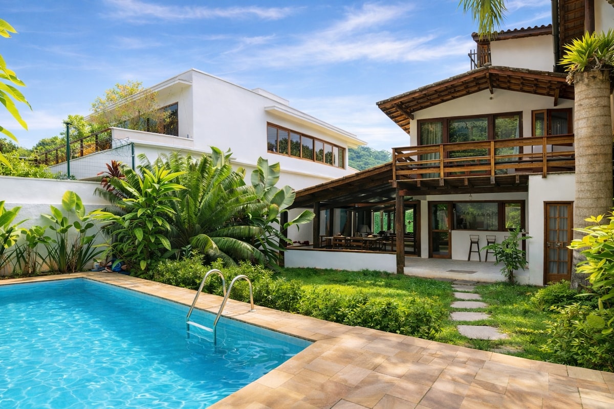 Casa integrada ao jardim, com piscina e áreas abertas para relaxar, a poucos minutos a pé da praia do Sahy. São 3 suítes com ar-condicionado e banheiro, garantindo conforto e privacidade. Sala e varanda com churrasqueira criam um ambiente ideal para dias tranquilos. Jardim exuberante, rua silenciosa, próxima da praia. Inclui roupa de cama, toalhas e itens essenciais.