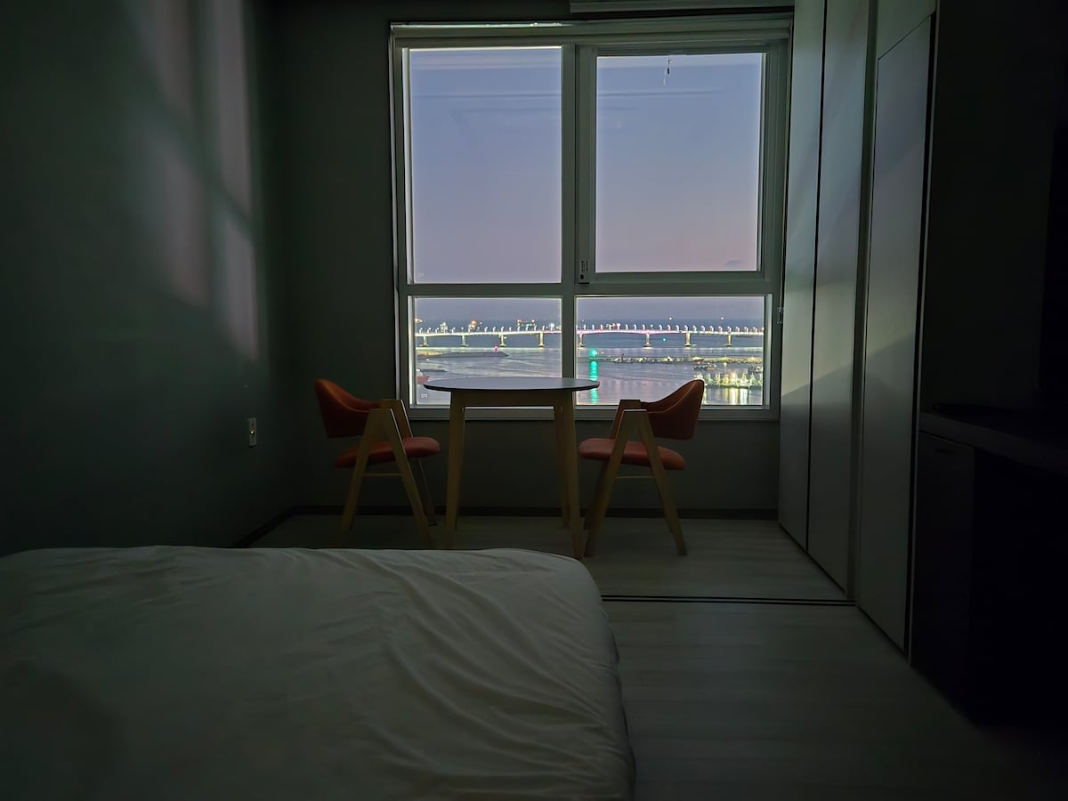 Այս սենյակը գտնվում է Բուսան Ջագալչի կայարանի 3 - րդ ելքի անմիջապես դիմաց ։ Տեղադրված է երկտեղանի մահճակալ, և դուք կարող եք վայելել գեղեցիկ Բուխանգի կամուրջը և սենյակից բացվող ծովի տեսարանը: Այն ունի լավագույն տեսարանը դեպի առավոտյան պարզ ծովի բոլոր տեսարանները: Բուսանի հիմնական զբոսաշրջային վայրերը, ինչպիսիք են Beef Square - ը, Kkangtong Market - ը և Jagalchi Market - ը, ոտքով հեռավորության վրա են, ինչը հեշտացնում է ճանապարհորդելը: Շրջակայքը լավ կահավորված է տարբեր հարմարություններով, ինչպիսիք են հարմարավետ խանութները, սրճարանները, ռեստորանները և դեղատները: Անվճար գերարագ Wi - Fi - ը և շուրջօրյա անվտանգության աշխատակիցներն օգնում են ձեզ ապահով մնալ, և բոլոր տարածքները չեն ծխում ՝ հաճելի միջավայր պահպանելու համար ։ Հագեցած է սառնարանով, լվացքի մեքենայով, սմարթ հեռուստացույցով և այլն ՝ այն հարմար է երկարաժամկետ այցերի համար ։ Անկողնային պարագաների և սենյակների մաքրումը նախատեսված է առնվազն 3 գիշեր տևողությամբ այցերի համար, և մենք երաշխավորում ենք հարմարավետ և անվտանգ ուղևորություն ՝ առանց շփման ժամանումով և SMS - ով ։ * Կարևոր է. այս շենքում մասնավոր կայանատեղի չկա, ուստի խնդրում ենք անպայման օգտվել մասնավոր կայանատեղիից (JS կայանատեղի և այլն), որը գտնվում է 5 րոպե հեռավորության վրա ։