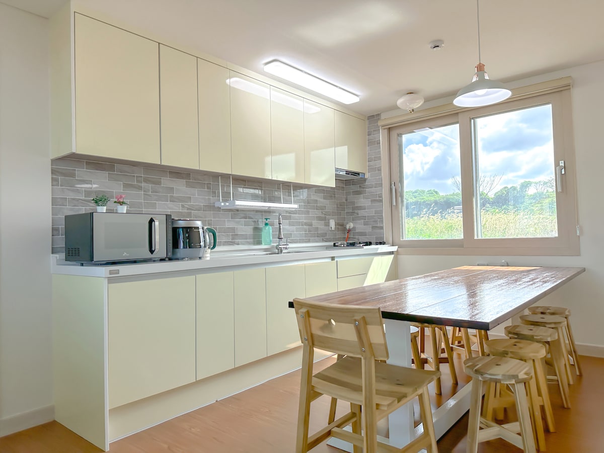 Մենք վերափոխեցինք ավանդական Ջեջուի ագարակը, Այն գեղեցիկ կացարան է ՝ կանաչ այգով ։ Հանգիստ արևմտյան Ջեջու գյուղում ՝ հանգիստ ագարակային հուզական կացարան Ժամանակ անցկացրեք ընտանիքի կամ սիրահարների հետ ։ Այն մոտ է Իլջու Ռոուդին, ուստի հարմար տարածք է Յունգմունով և արևմտյան ափով ճանապարհորդող հյուրերի համար ։ Մոտակա ափը մի վայր է, որտեղ հաճախ ուղղվում են երեկոյան գեղեցիկ մայրամուտներ ։ Մոտակայքում կա մի ափ, որտեղ կարող եք հանդիպել հարավային դելֆինների ընտանիքի, որոնք անցնում են Ինդիգո ծովով, այնպես որ կարող եք վայելել էկզոտիկ հիշողություններ: Մենք առաջարկում ենք մասնավոր տարածք քարե պատի մեջ և զգում ենք պարտեզ, որը հարմարավետորեն փաթաթում է տարածքը ։ Ամբողջ ընտանիքով հանգստացեք մեր հարմարավետ տարածքում Երեխաների համար կա մանկական ճաշասեղան, աթոռ և մանկական լոգասենյակ, այնպես որ հանգիստ ժամանակ անցկացրեք երեխայի հետ ~ Հյուրընկալողի ուղեցույցում ՝ տարածքի ստորին վայրում, կան մոտակա տեսարժան վայրեր, ռեստորաններ և երեխաների հետ այցելելու վայրեր, որոնք ուզում եմ զգալ և խորհուրդ տալ հյուրերին ։ Մենք հրապարակել ենք դրանցից մի քանիսը ։ Լավ կլիներ անդրադառնալ դրան ։ Դա փոքր գումար է