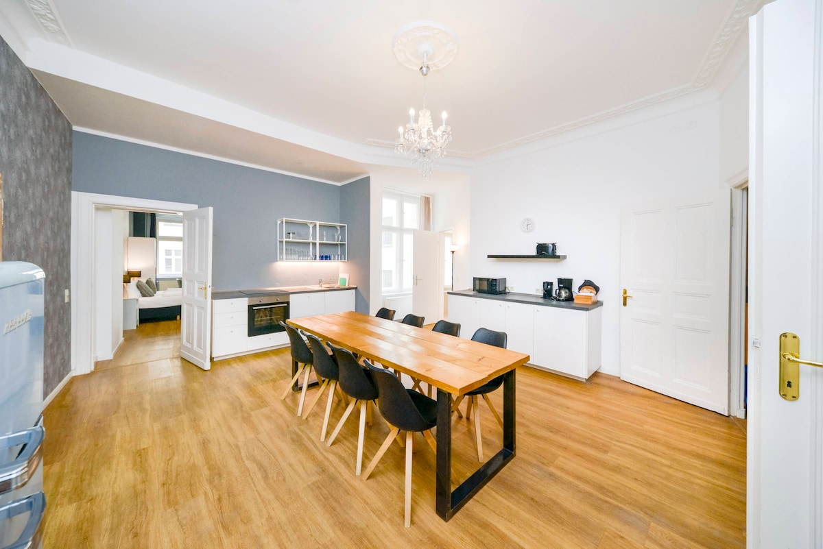 Մեր շատ մեծ տիպիկ բեռլինյան ոճի բնակարանները հարմար են 3 առանձին սենյակներում մինչև 8 հոգու համար: Մեր բնակարանները հատկապես հարմար են ընտանիքների և ընկերների խմբերի համար: Լավ երեկոները միասին մեծ խոհանոցի սեղանի շուրջ երաշխավորված են: Հյուրասենյակում կա պատշգամբ, որտեղից կարող եք տեսնել Schoenhauser Allee - ն ։ Բնակարանները գտնվում են շենքի դիմացի հատվածում ՝ 2 -4 - րդ հարկում (առանց վերելակի):