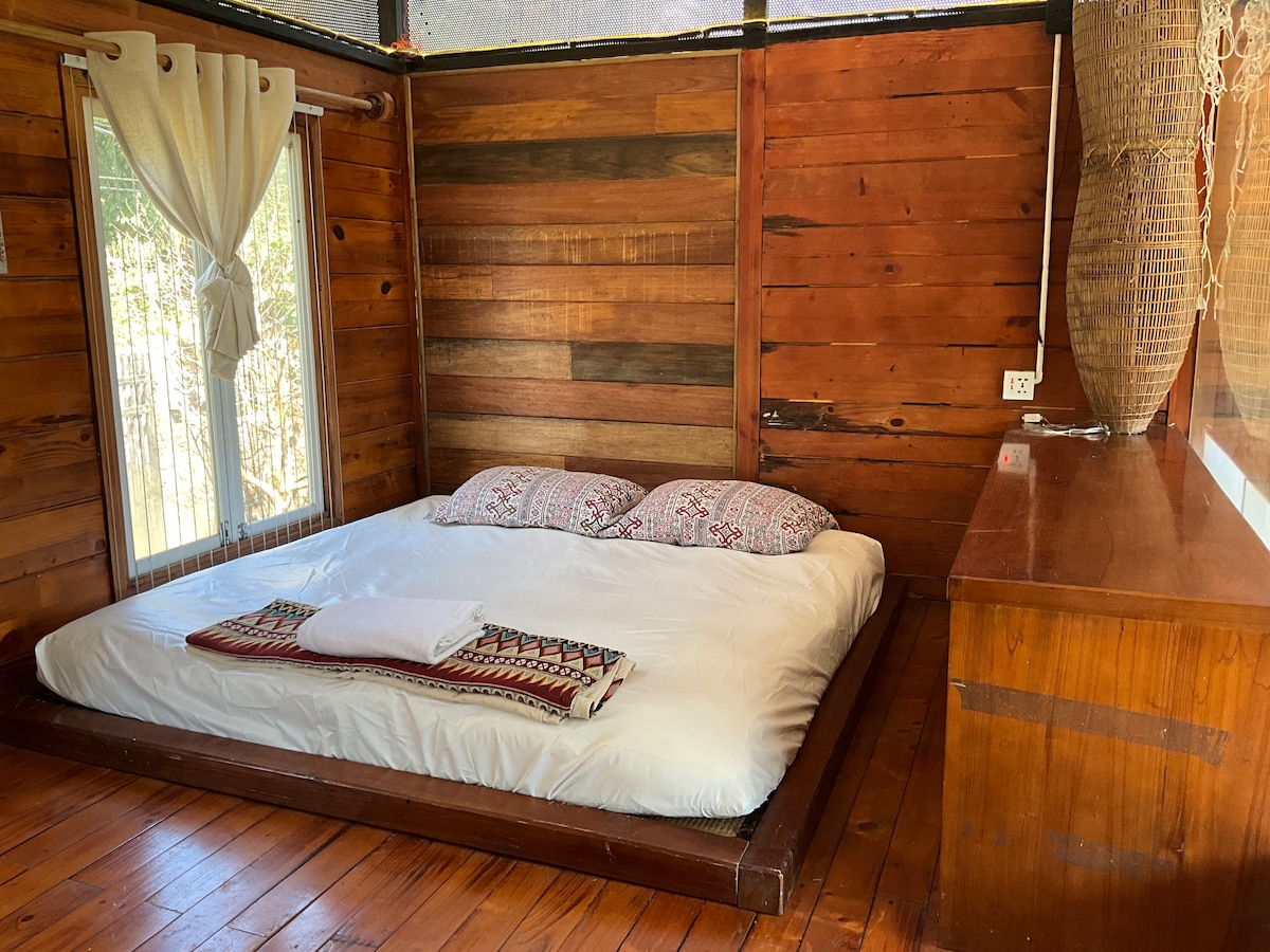 Homestay nhà mình tên là Samma Stay Tam Đảo. Mình có 3 phòng nhà Núi (Mountain Cabin), Nhà Vườn (Cabin by the Garden), Nhà Suối (Cabin by the Stream). Đây là Nhà Suối - căn nhà được yêu thích nhất vì bao bọc bởi 1 con suối nhỏ bên tay phải. Nhà Suối tách biệt với các không gian khác nên đây là một nơi trốn lý tưởng. Buổi tối khi kéo rèm lại và bật đèn lên, bạn sẽ cảm nhận một không khí đầm ấm, riêng tư, với nhạc nền là tiếng suối.