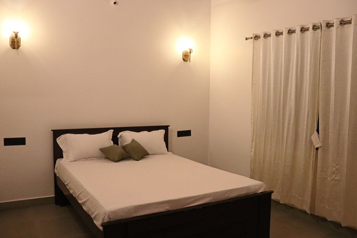 DIA is a cozy, air-conditioned one-bedroom space located in the heart of Mangalore city. This bright, ground-floor unit features large windows, a comfortable bed (king-size or single), a kitchen, a living area, and an attached bathroom. It offers easy access to public transportation, with a rickshaw stand nearby for convenient travel.