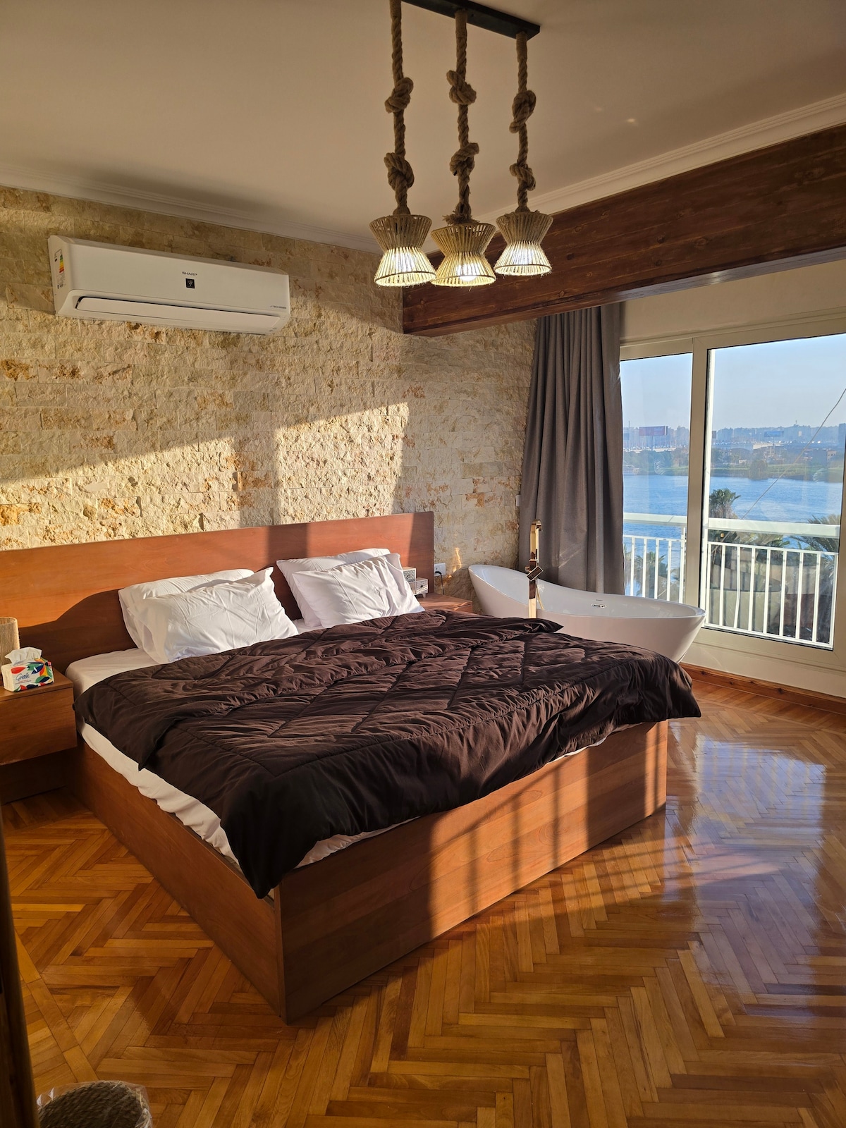 Nile.Dorra ՝ շքեղ Բոհո - Սթայլ Զգացեք նրբագեղություն Կահիրեի սրտում գտնվող այս ցնցող երեք ննջասենյակով բնակարանում, որը նայում է դեպի Նեղոս ։ Վայելեք գետի և բուրգերի հիասքանչ տեսարանները ձեր պատշգամբից: Ընդարձակ բնակելի տարածքում կա փարթամ կղզի և համադամասերական խոհանոց, որը կատարյալ է զվարճանքի համար ։ Յուրաքանչյուր յուրահատուկ լոգասենյակ առաջարկում է սպայի նման փորձառություն ՝ բնական փայտով և քարե հատակով և պատերով, հանգստացեք բացօթյա ճոճանակին և ընդունեք ժամանակակից հարմարությունները ։ Ամրագրեք *Nile.Dorra* անմոռանալի հանգիստ