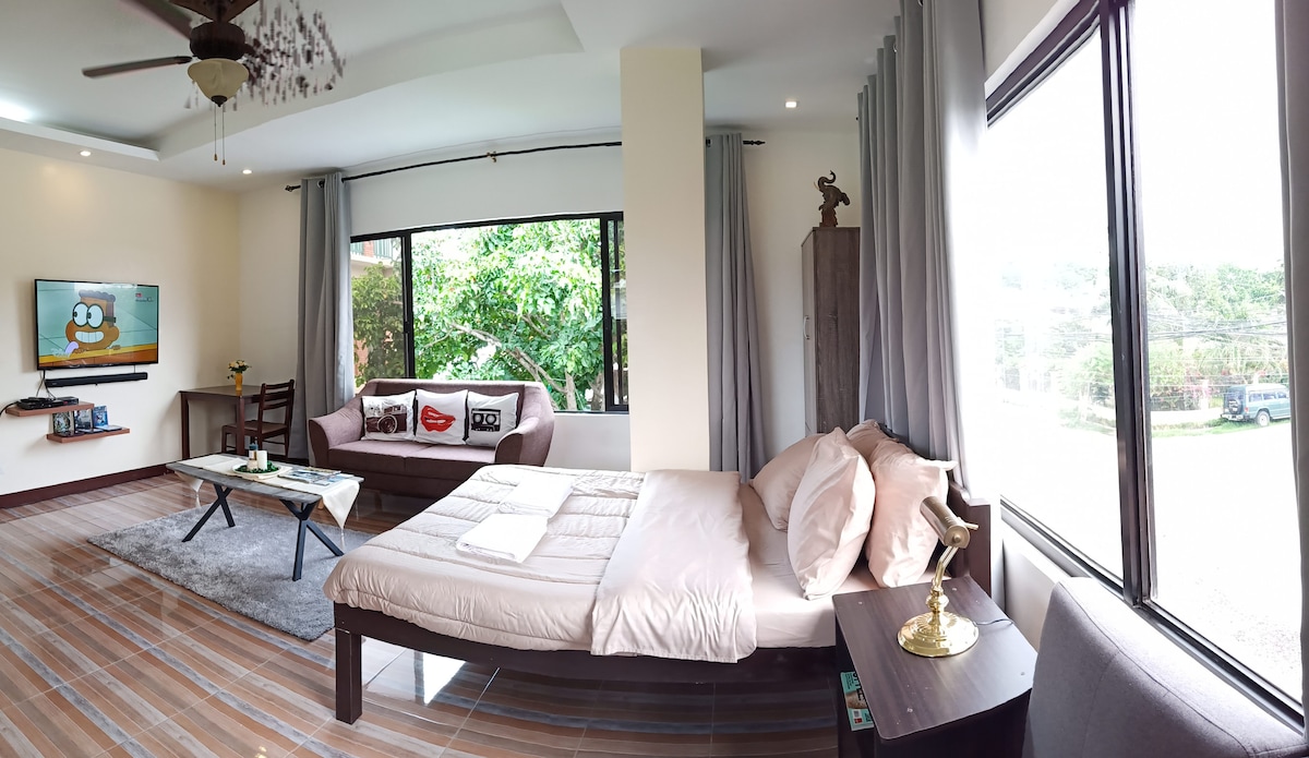 Newly built detached studio; located at the heart of a peaceful, clean, yet accessible town. ATM is located beside the property. The town plaza, market, resorts, restaurants, churches, fire station, health center, and police station are all in walking distance. Please take note that this is a detached studio pad with full functioning kitchen. This room is not by the road but you may hear noises like: dogs from neighbors. Other services: Food room service Laundry Transpo & tours Printing