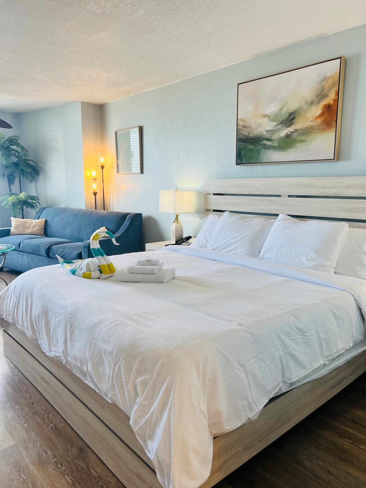 Enjoy a relaxing stay in the Horizon Suite at Atlantic Shores, featuring a full kitchen and space for the whole family, including doggies 🐶, just literal steps from Daytona Beach 🌊. This bright, spacious suite includes a king bed, twin daybed, and queen sofa bed, sleeping up to 5 guests. Cook your fav meals in the fully equipped kitchen with coffee maker, waffle maker, toaster, cookware. Parking, Wifi, TV streaming included