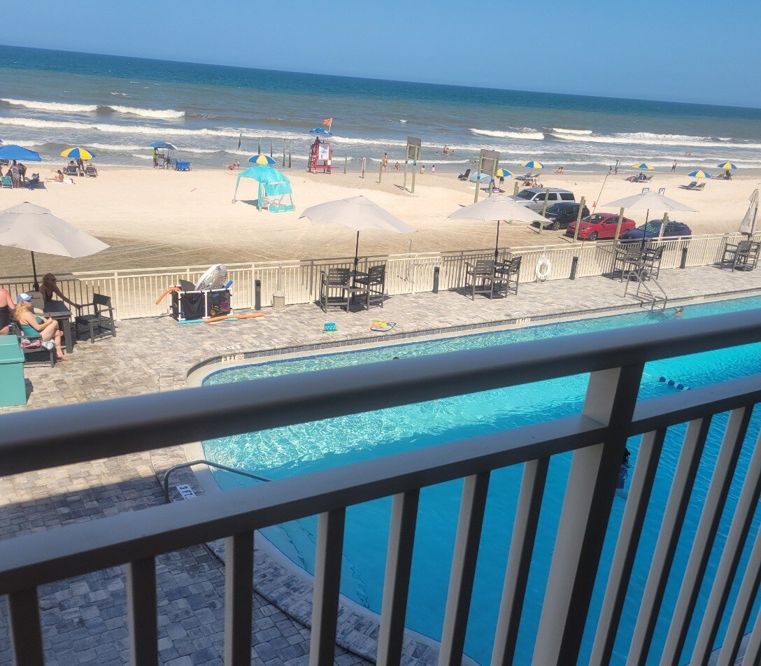 Enjoy our Heated indoor pool We are located on Daytona Beach a 1 minute walk through the pool area to be on the beach. With open pool Netflix Included, Experience our newly renovated King room studio, large balcony with amazing beachfront views it feels like you are on a cruise ship over the ocean. We have all kitchen items needed for cooking and we provide Coffee, cream, sugar .We provide all linens and towels and Beach towels and beach chairs.