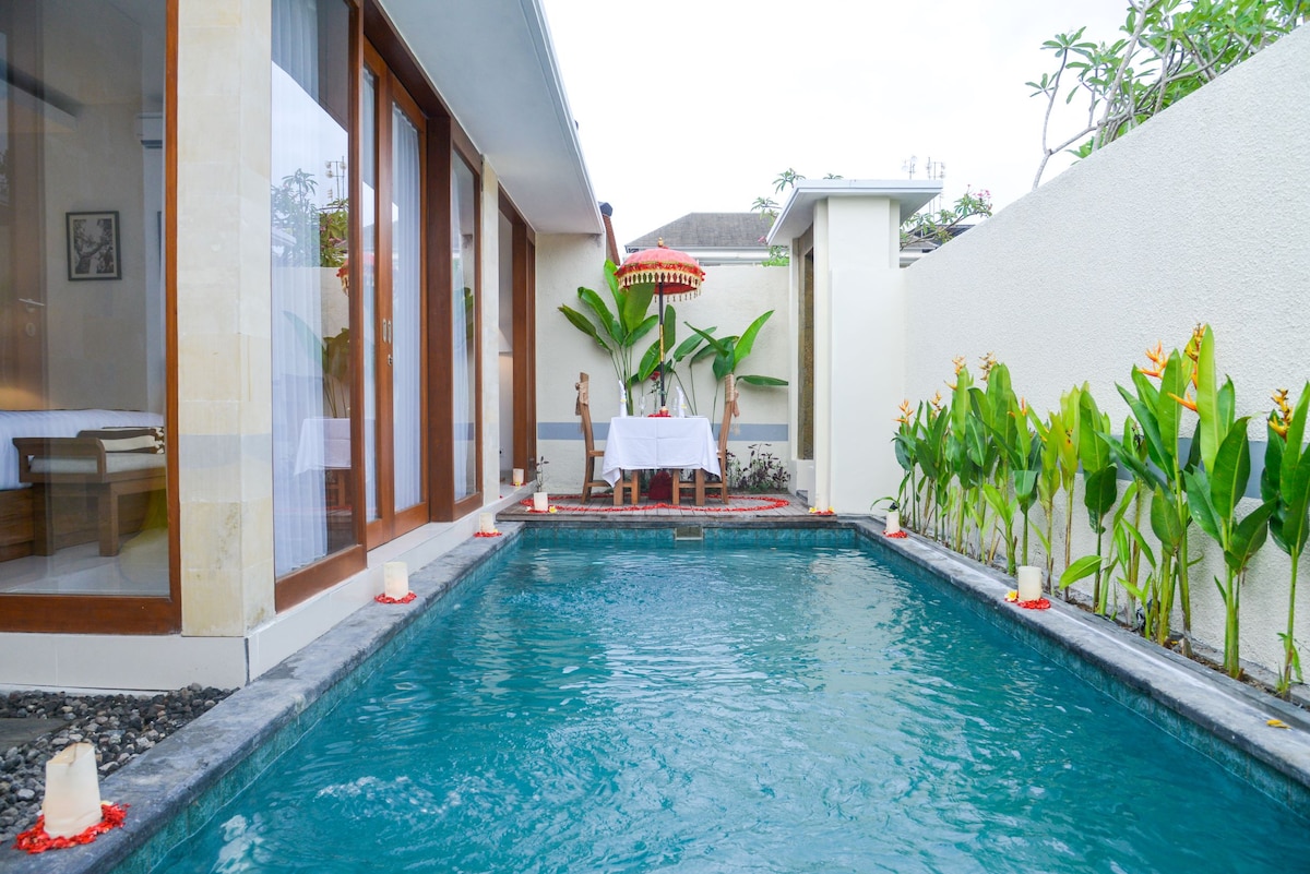 1 Bedroom Villa which is equipped with a private swimming pool and gazebo is very suitable for young and old couples where the villa provides peace and comfort and our24hrs staff at the front desk who will assist you at any time during your stay at our villa Villa located only within walking distance for shops, restaurant, and beach and Drive for A 5-minute drive to Bali Galleria Mall, the resort is also a 15-minute ride to Ngurah Rai International Airport. Kuta ride