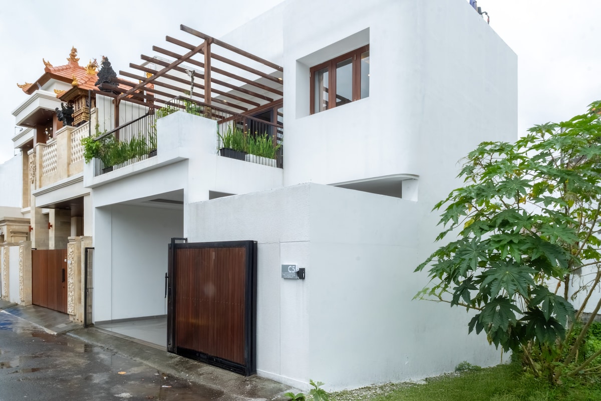 New shiny minimalist villa with sufficient air ventilation. Close to jogging track. and merta sari beach. 5 minutes to supermarket. 35 minutes to airport Details : One bedroom with en-suite bathroom on the second floor.also Washing machine, kitchen. dining table and living room area on the first floor Parking for motorbike , private swimming pool 3x4 M2. car access. facilities include : Cleaner, pool maintenance 2x a week , Garbage collection fee, hot water, wifi, Kitchen appliances.