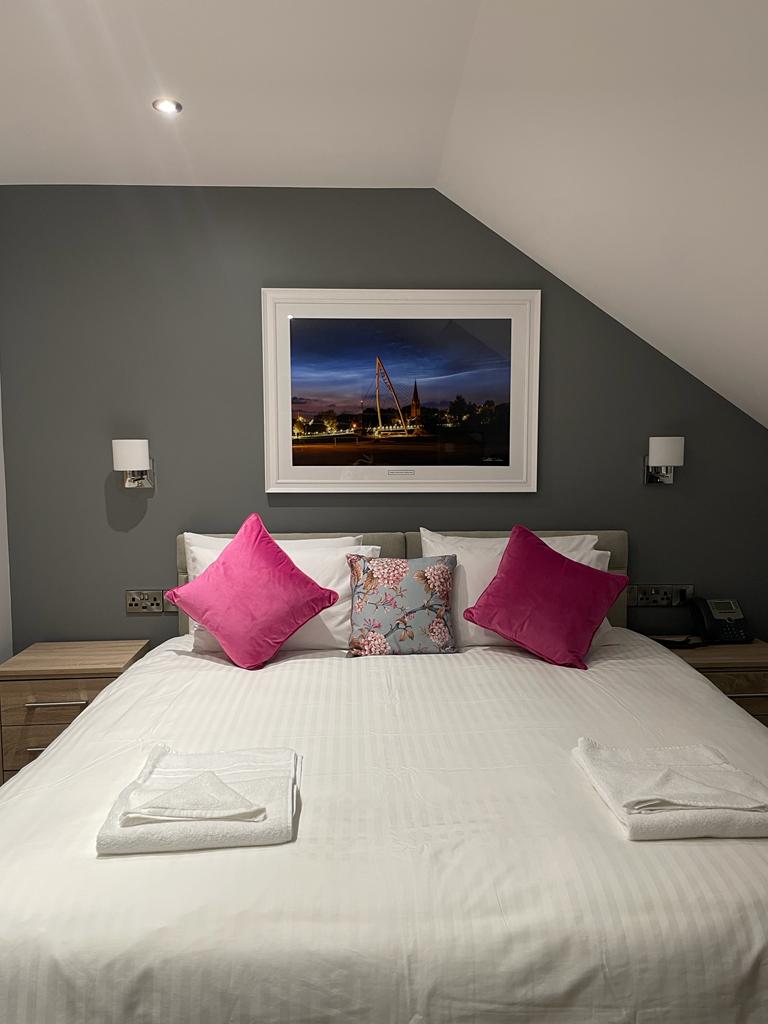 There are double, twin rooms, super king and disabled access rooms that are designed with cool tones with a pop of colour including a picture of the best landmarks within the Strabane area, ideal for business and private stays. A lift is accessible to arrive at the ground floor, where our restaurant is located. A vast variety of dishes are available from 12 noon to 9pm along with our extensive, flavorful cocktails suited for a romantic meal for two, family meals or bigger parties/ occasions.