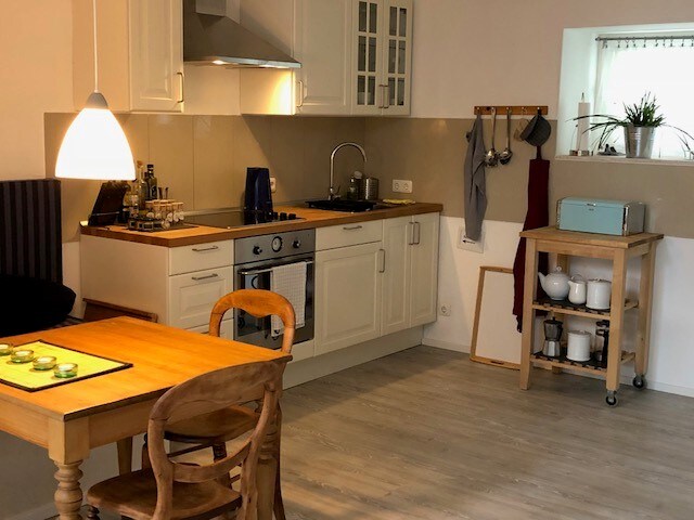 Die Ferienwohnung ist einfach, gemütlich, naturnah für 2 Erwachsene+Kleinkind+Hund Küche mit Esstisch für 4 Personen, Lesesessel, Backofen, Toaster, Kaffeemaschine, Wasserkocher, Koch-Ess-Grundausstattung, bioTee, bioFilterkaffee, bioÖl, bioEssig WohnSchlafraum Bad mit Dusche Balkon mit Gartenblick+Sitzgelegenheit Spirit of Om Bettwäsche+Handtücher Auf der gleichen Etage ist unser Sonnenzimmer. Wenn Ihr zu viert reist: Einfach dazu buchen. https://www.airbnb.com/slink/Loatly6i