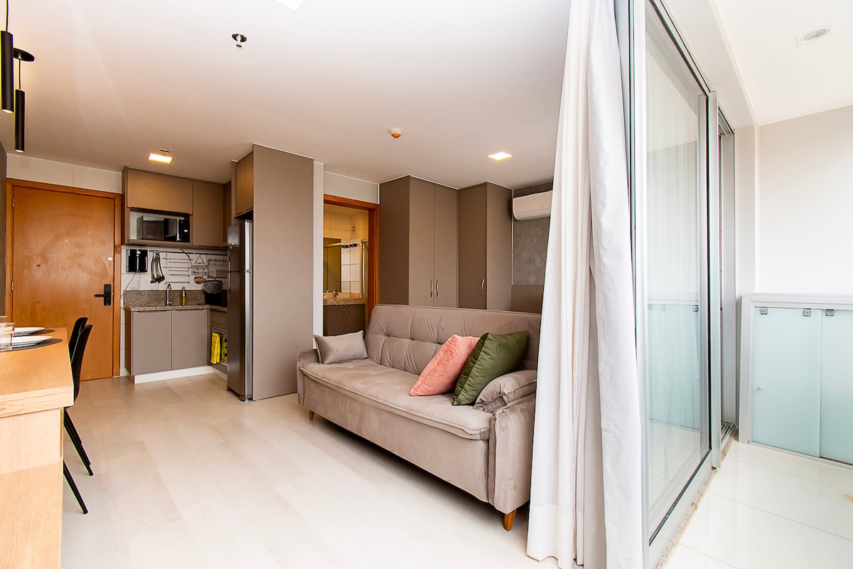 Շքեղ բնակարան DF Plaza - ում ՝ Águas Claras - ում, իդեալական է զույգերի կամ ղեկավարների համար ։ Այն ունի երկտեղանի մահճակալ, թախտ, օդորակիչ, Wi - Fi և կահավորված խոհանոց ։ Ժամանակակից և ֆունկցիոնալ դեկորացիա ։ Գտնվում է առևտրի կենտրոնի ներսում ՝ ռեստորաններից, սուպերմարկետներից, դեղատնից և մարզասրահից օգտվելու հնարավորությամբ ։ Շենքն առաջարկում է լողավազան, լվացքատուն, անվճար կայանատեղի և շուրջօրյա դռնապան ։ Հարմարավետություն և գործնականություն ՝ հիանալի վայրում ։