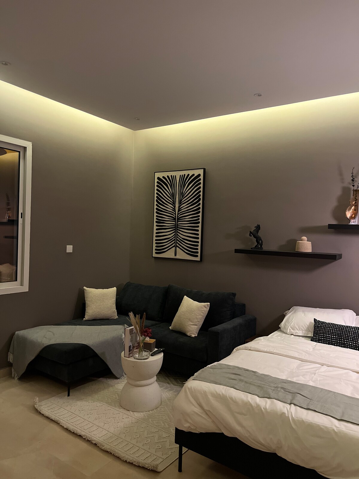 Enjoy a stylish experience at this North-located place in Al Malqa. Comes with smart lock and door isolation for extreme comfortable stay. Located in the north of Riyadh and just 20 minutes from the airport, 5 minutes from Riyadh season entertainments zones and 10 minutes from Al-Diriyah historic town. The apartment comes with high speed fiber internet, 65 LED 4K TV, KING size bed with extra mattress pad for comfortable sleep and free parking.