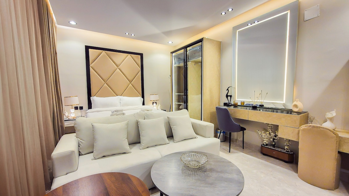 Ժամանակակից դիզայնով նորաոճ և հարմարավետ բնակարան, որը համադրում է հարմարավետությունն ու նրբագեղությունը ։ Այն ներառում է ժամանակակից կահույք և ջերմ երանգներ, որոնք ստեղծում են հանգստացնող մթնոլորտ ՝ մտածված լուսավորությամբ ՝ մթնոլորտը բարելավելու համար: Բնակարանը հագեցած է սմարթ հեռուստացույցով ՝ ժամանցի, գեղարվեստական շտրիխների և ժամանակակից ձևավորման համար, որոնք հմայք են հաղորդում: Լիովին կահավորված ինչպես կարճաժամկետ, այնպես էլ երկարաժամկետ այցերի համար ՝ այն իդեալականորեն գտնվում է Էր Ռիադի հիմնական տեսարժան վայրերի և հիմնական ծառայությունների մոտակայքում ։