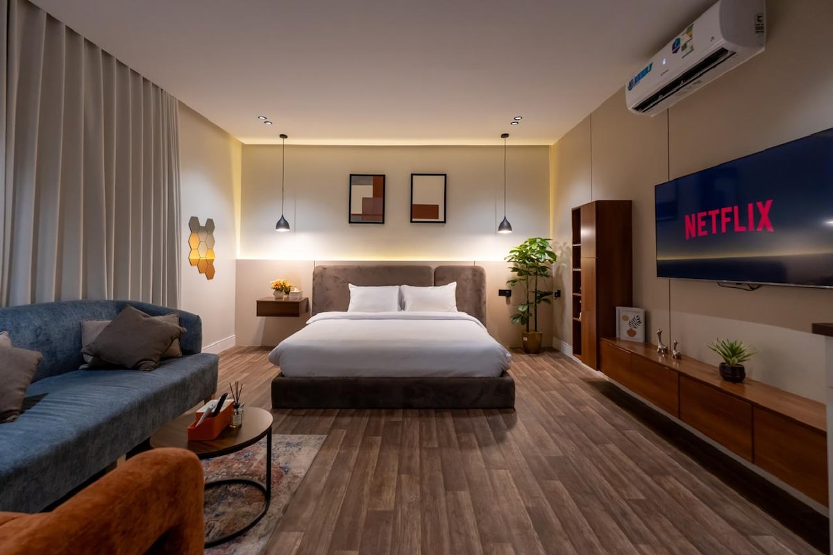 Ջերմ և հարմարավետ դիզայնով ստուդիա, որը իդեալական է հանգստի կամ աշխատանքի համար ։ Այն ունի գլխավոր մահճակալ, 65 դյույմանոց էկրան ՝ Netflix - ով, լիովին կահավորված սուրճի անկյուն և նստատեղ ։ Հյուրանոցային ծառայությունը, Wi - Fi - ը, մաքրող անձնակազմը և վերահսկիչը միշտ պատրաստ են ծառայելու ձեզ ։
