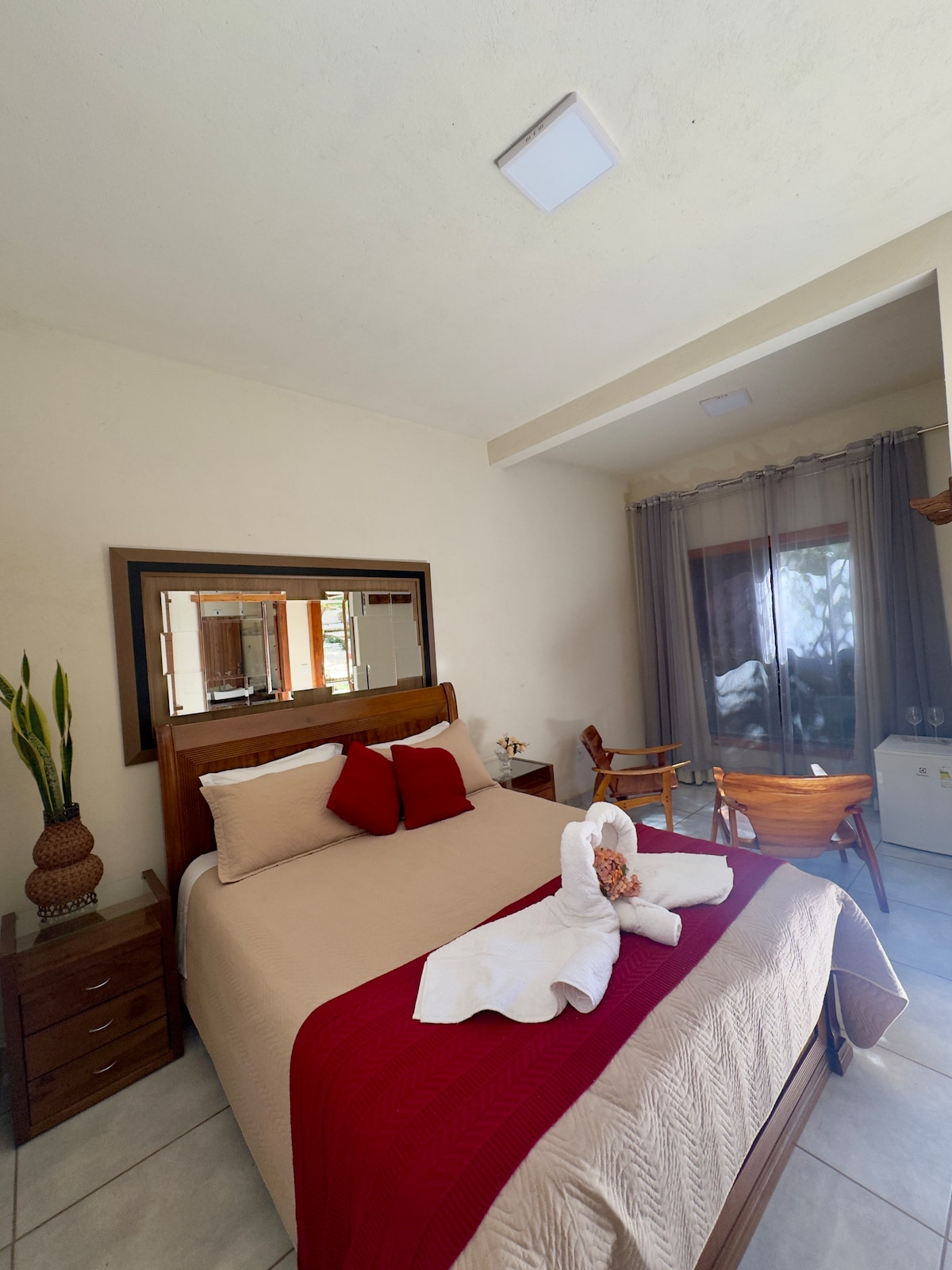 Possui ar-condicionado, frigobar, smart TV, chuveiro duplo, secador de cabelo, cama queen, espelho com LED, cama auxiliar casal ou solteiro.
