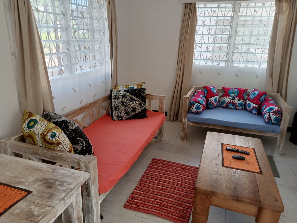 A simple, less is more interior decor 1bedroom house in Central Diani. Spacious, bright and perfect for short or long stays. A comfortable large sofa bed chair in the living room, flat screen smart TV, fast wifi and a dinning area that can be used as a study/work table. A fully equipped kitchen, queen size bed in the bedroom, a clean bathroom stocked with towels and toiletries. High roof with ceiling fans, extra standing fans, dehumidifier & large louvre glass windows for air circulation.