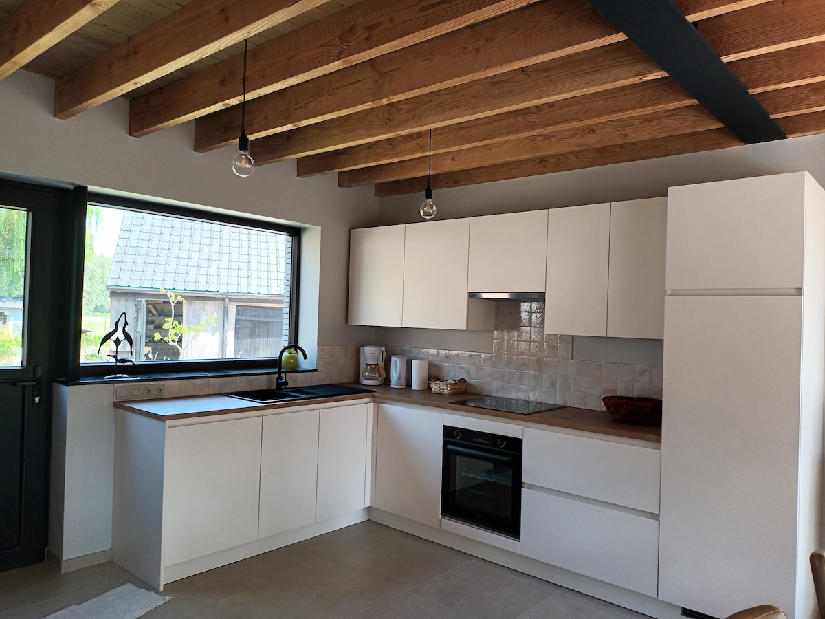 Գեղեցիկ ձևավորված, առանձնացված հանգստյան տուն ՝ յուրահատուկ տեղադրությամբ և գյուղական տեսարանով ։ Իդեալական մեկնարկային կետ է բազմաթիվ բնության գրկում զբոսանքի և հեծանվային զբոսանքների համար: Մեկ այլ գոհար է ծովը, որը գտնվում է 7 կմ շառավղով: Քոթեջն ապահովված է բոլոր հարմարություններով: Լավ կահավորված խոհանոց, հարմարավետ նստատեղ և պատի հարմարավետ սենյակ ։ Կա 3 ննջասենյակ և ցնցուղով լոգասենյակ ։ Կա նաև առանձին այգի ՝ այգու կահույքով և մանղալով ։