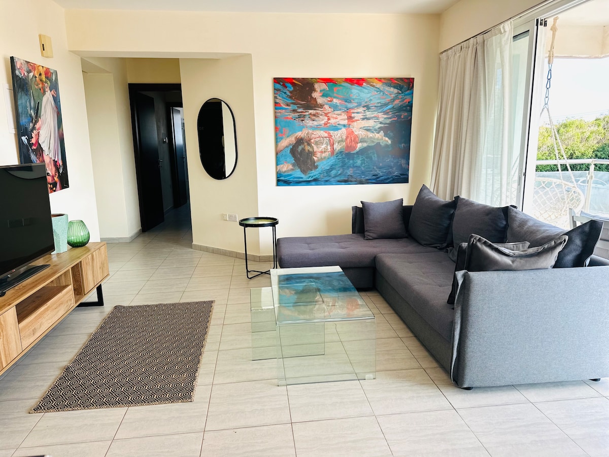 A majestic 3-bedroom seafront apartment with a massive sea view veranda at the BEST location in Protaras. We are located 1minute walk from the seafront and in-between 2 amazing beaches: Sunrise beach and the award-winning Fig Tree Bay. Simultaneously, our complex, is located 30 seconds away from the main Protaras strip. Suitable for groups, couples and families. The apartment is tastefully furnished and fully equipped, with an amazing panoramic view of the Mediterranean Sea. We take pride in allowing our guests to feel straight at home and providing amenities even for the most demanding guests. All rooms are fully air-conditioned with high speed internet. The apartment is equipped with a personal Hot tub, a private outdoor bar, outdoor barbecue grill, sunbeds, kids trampoline, ping pong table and a satellite smart TV(with Netflix and channels from over 10 countries).