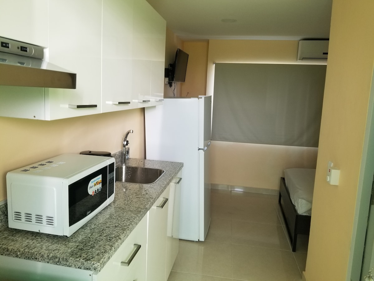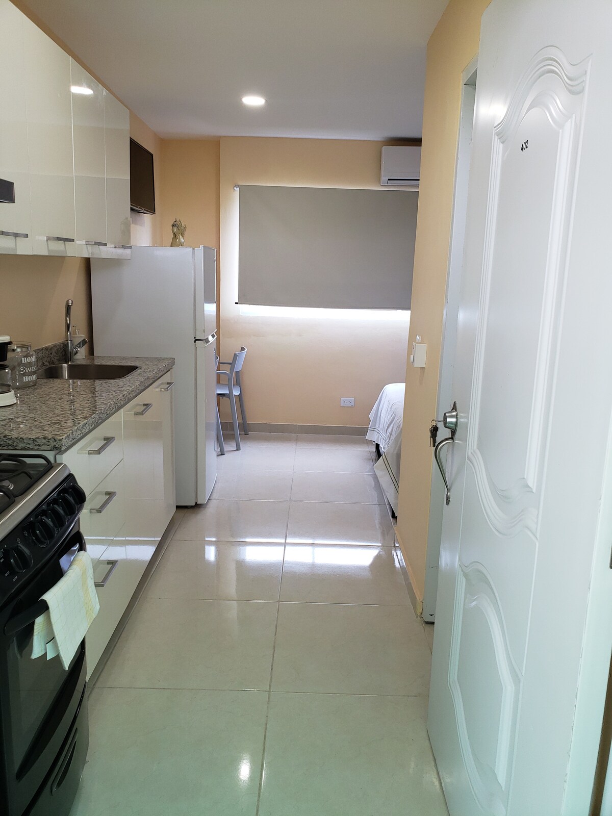 Bonitos y acogedores departamentos estudio completamente equipados con: Aire acondicionado Planta Full Gas por tubería Televisión con 800 canales internacionales Lavandería Microondas Restaurante Bar Terraza Apartamento totalmente independiente, somos un aparta-hotel con 21 apartamentos y queremos que sepan que no es un apartamento compartido.
