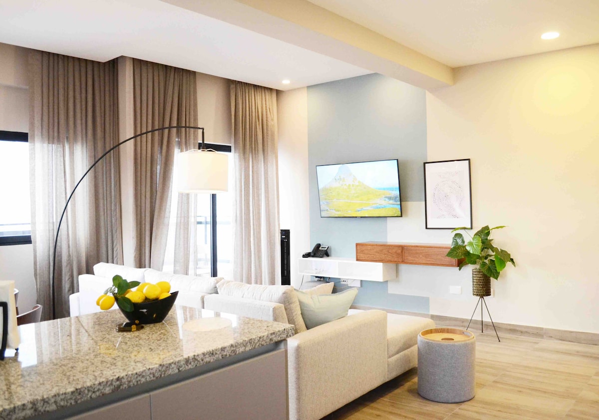 This apartment is a dream. Located in the most premium area of the country, Piantini, everything is close by. This apartment is located on the fourth floor with spectacular views of the capital. It includes two bedrooms and 2.5 bathrooms and can accommodate up to 5 guests. It includes an equipped kitchen and washer & dryer. This building has a 1,200 square meter social area consisting of a roof-top infinity pool, gym, zen area, and children's play area.