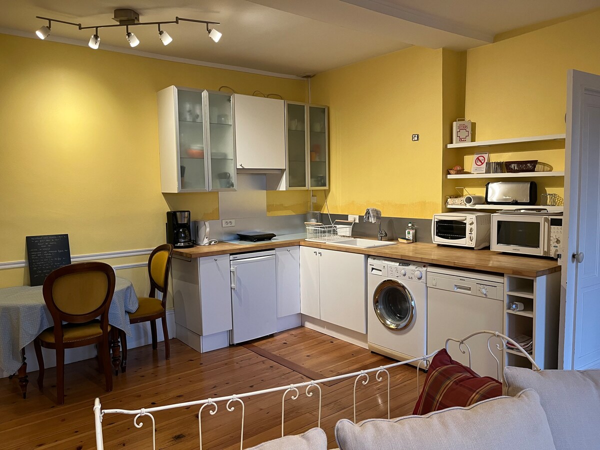 Մեր 33մ² մակերեսով նորակառույց տարածքն ունի օդորակիչ և գտնվում է Դիժոնի հմայիչ, պատմական կենտրոնից ։ Մեր տան հետևի առանձին փոքր շենքում դուք կունենաք ձեր սեփական հյուրասենյակը/խոհանոցը, առանձին ննջասենյակը և լոգասենյակը: Տան դիմաց կա անվճար հանրային կայանատեղի փողոցում ։ Դուք անմիջապես կլինեք Palais des Congrès - ի և Auditorium - ի հարևանությամբ, և տրամվայով կարճ ուղևորություն դեպի երկաթուղային կայարան, համալսարան և հիվանդանոց ։ Մոտակայքում կան սուպերմարկետներ և այլ խանութներ ։ Nous parlons également français.