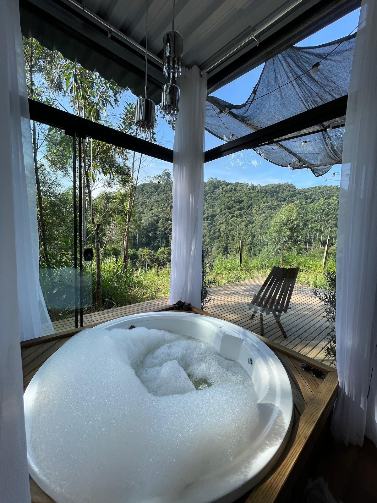 Շատ հարմարավետ տնակ, որը գտնվում է Doutor Pedrinho - ի կենտրոնում, քաղաքապետարանի բոլոր բնական գեղեցկություններից հեշտությամբ օգտվելու համար: Նրա արտոնյալ վայրը ՝ բլրի գագաթին, ապահովում է քաղաքի ամենագեղեցիկ տեսարանը ։ Այն նախագծվել է ապակու լայն օգտագործմամբ ՝ իր շուրջը բնության գրկում ընկղմվելու համար ։ Այն ունի բուխարի և օֆուրո ՝ հիդրոմերսմամբ ՝ հյուրերի լիակատար հանգստի համար ։ Մենք տրամադրում ենք բոլոր հիմնական պարագաները հարմարավետ հանգստի համար ։ Իդեալական է հանգստանալու և տեղանքի փարթամ բնապատկերը վայելելու համար ։