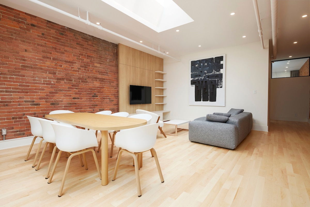 Stunning Old Port penthouse combining historic charm with sleek modern design. Sleeps 8 across one private bedroom and two stylish lofted rooms, each with tall partitions and locking doors. Soaring ceilings, exposed brick, and warm, elegant finishes throughout. Enjoy a chef’s kitchen, 65" HDTV & projector for movie nights, a gaming nook, and a compact office space. Steps from Montreal’s best dining, shops, and culture.