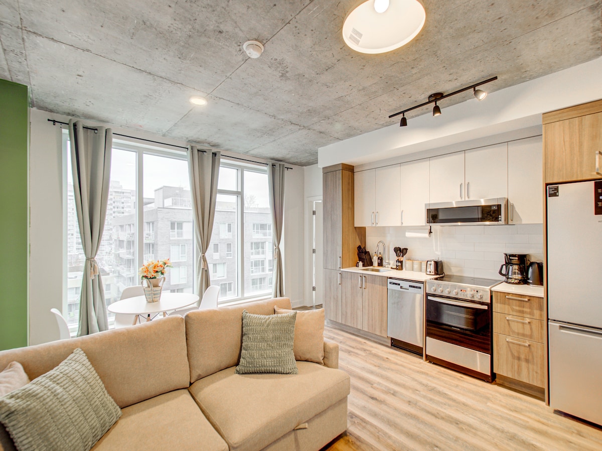 Այս լուսավոր, ժամանակակից բնակարանից բացվում է Մոնրեալի համայնապատկերը ՝ հիասքանչ մայրամուտներով ։ Ինտերիերն առանձնանում է բնության գրկում ՝ հանգստացնող ձիթապտղի երանգներով, ինչը ստեղծում է ջերմ և հանգստացնող մթնոլորտ ։ Իդեալական վայր է Սենտ - Քեթրին փողոցում ՝ Ատուոթեր և Գայ - Կոնկորդիա մետրոյի կայարաններից մի քանի քայլ հեռավորության վրա, դուք շրջապատված կլինեք գերժամանակակից սրճարաններով, ռեստորաններով, խանութներով և Ալեքսիս Նիհոն առևտրի կենտրոնով: Կատարյալ վայր Մոնրեալի աշխույժ էներգիան վայելելու համար ՝ միաժամանակ զգալով ինչպես տանը ։