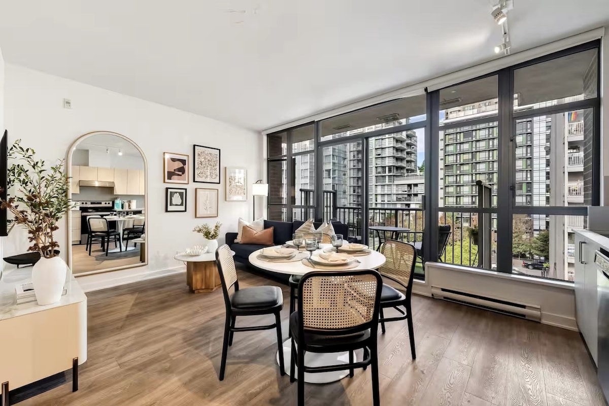 Զբաղվեք շքեղ հանգիստով այս կենտրոնում գտնվող 2 BR, 2 լոգարանի կոնդոմինիումով ՝ ձեր սեփական ՋԱԿՈՒԶԻՈՎ պատիոյի օազիսով ՝ կրակե սեղանով, որտեղից բացվում է տեսարան դեպի Ռոջերս Արենա և Վանկուվեր ։ Պատկերացրեք, որ խմիչքները խմեք լոգարանում կամ կրակե սեղանի շուրջ ՝ մեծ խաղի կամ համերգի ավարտից րոպեներ անց ։ ԱՆՎՃԱՐ ԿԱՅԱՆԱՏԵՂԻ և ընդամենը մի քանի քայլ Skytrain - ից, Gastown - ից, Chinatown - ից, ծովի պատից և հիանալի ռեստորաններից/մթերքներից: Կռուիզ նավի տերմինալը և քաղաքի կենտրոնը կարճ ոտքով են, Uber - ը կամ 1 -2 գնացքը կանգ է առնում: Բարի գալուստ Վանկուվեր ։